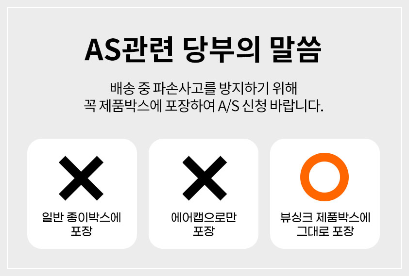 즉, 뷰싱크의 원래 제품 박스에 포장하여 AS를 신청해야 안전한 배송이 가능하며, AS 처리가 원활히 이루어질 수 있습니다. 이점 참고 하시길 바랍니다.